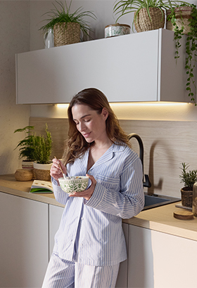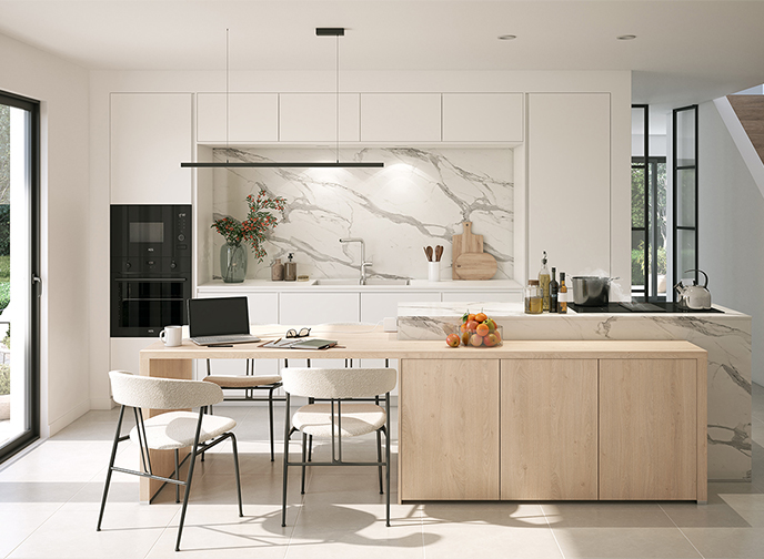Sa neutralité lumineuse en fait un fond idéal pour jouer avec les matières. Associé à du bois clair, il crée une ambiance chaleureuse et organique. Avec un plan de travail en marbre blanc veiné, il gagne en élégance sans ostentation. Relevé de touches de noir mat — robinetterie, poignées, hotte — il acquiert du caractère et de la profondeur. Et entouré de plantes, il devient la toile parfaite d’un intérieur vivant.