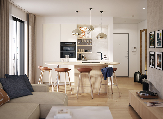 La cuisine est la pièce de la maison où l’atmosphère compte autant que la fonctionnalité. On y commence ses journées, on y reçoit, on y crée. Le Cloud Dancer y trouve sa place naturellement : il apporte la clarté sans agressivité, la douceur sans fadeur.