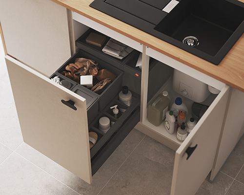 Ce meuble sous-évier combine astucieusement un coulissant dédié aux poubelles de tri et rangements, et une zone fermée par porte pour stocker facilement vos produits d’entretien. Une organisation claire, fluide et pratique pour garder une cuisine toujours ordonnée.