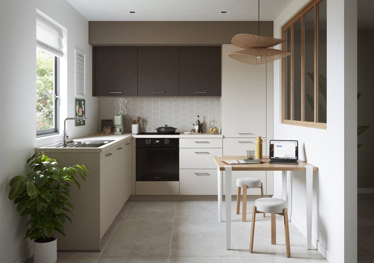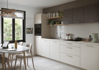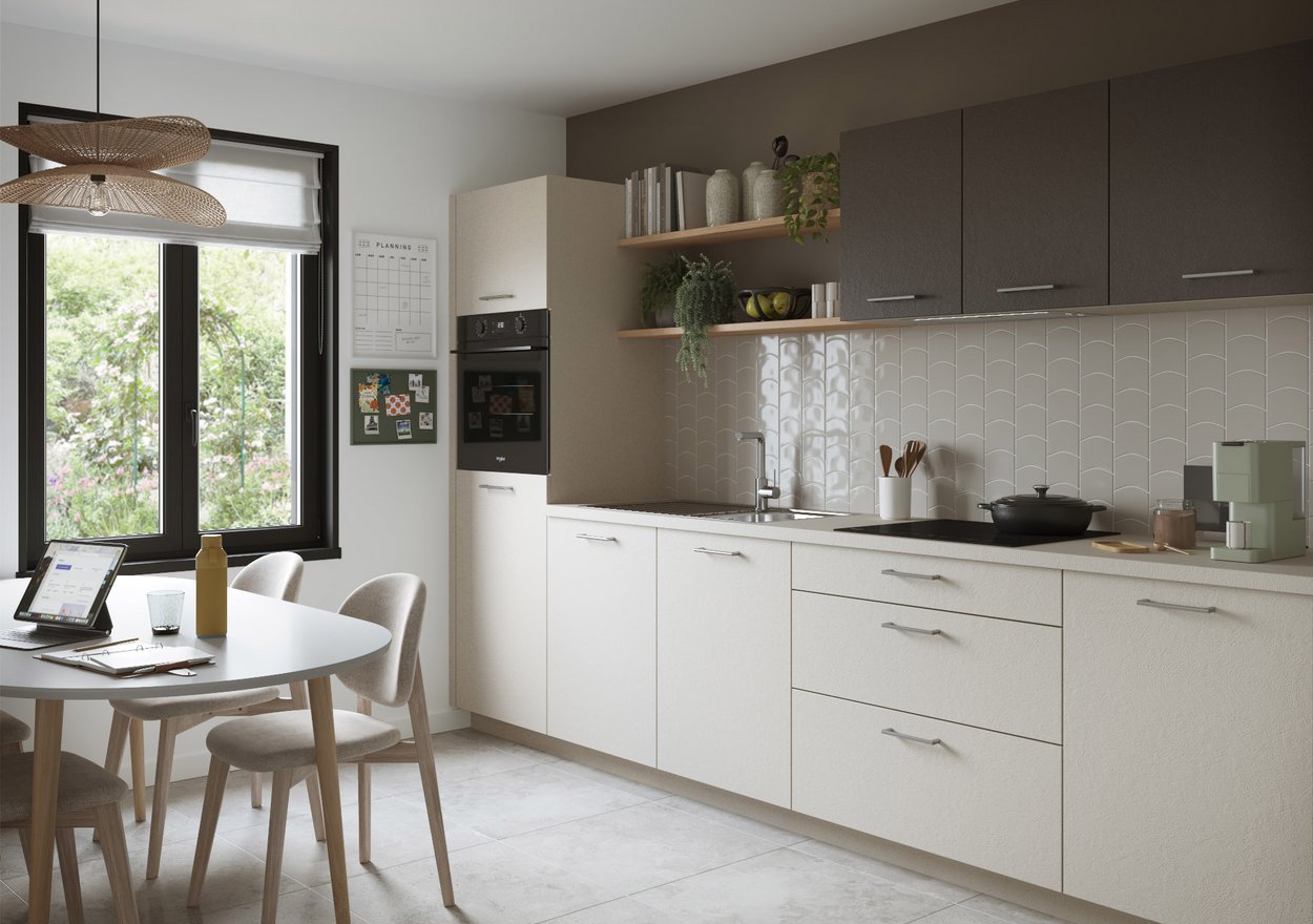 Avec ses façades subtilement texturées et son design chaleureux, la cuisine Dune conviviale transforme la cuisine en un véritable espace de vie. Moderne et naturelle, elle s’intègre harmonieusement à tous les intérieurs.