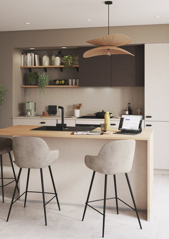 Son îlot central, à la fois espace de préparation, coin repas et point de rencontre, crée un lieu polyvalent où l’on aime cuisiner, travailler un moment ou partager un verre entre amis. Les rangements bien pensés et l’agencement fluide offrent un confort d’utilisation au quotidien.