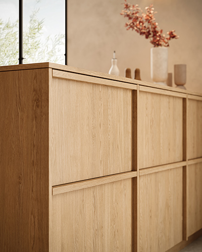 Conçue en chêne de come, elle révèle la chaleur du bois naturel, sublimée par la légèreté des façades blanches sur les meubles hauts. Ses joues soignées et ses poignées typiques du style Japandi lui confèrent un caractère à la fois authentique et intemporel.