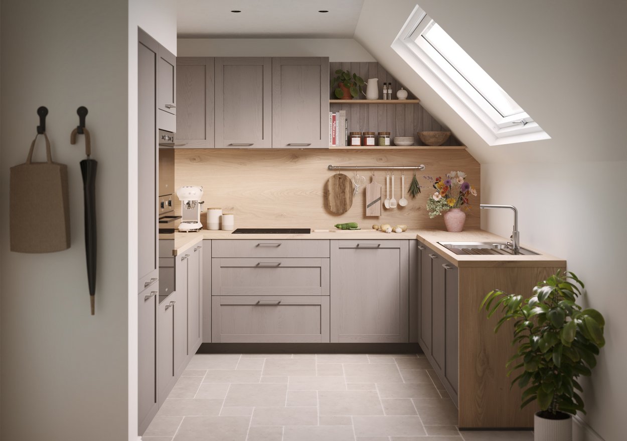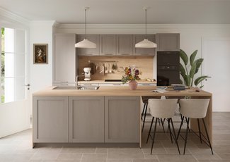 La rencontre du bois du plan de travail et des façades "macchiato" subtilement texturées crée une atmosphère douce et lumineuse, propice au partage et à la convivialité. Les jeux de lumière et les contrastes délicats soulignent la beauté naturelle de l’ensemble.​