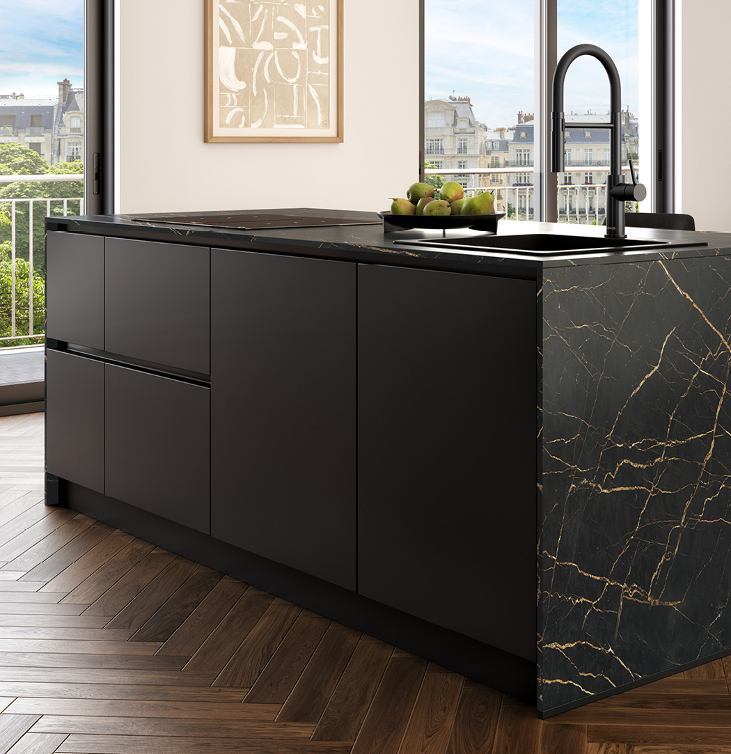 Cuisiner, prendre ses repas, ranger ses ustensiles… On peut tout faire avec cet îlot central à la fois décoratif et fonctionnel ! Et avec son nouveau dos effet bois, allié à l'effet marbre noir et ses veinures dorées, pas de doute : votre cuisine sera à la pointe du design.