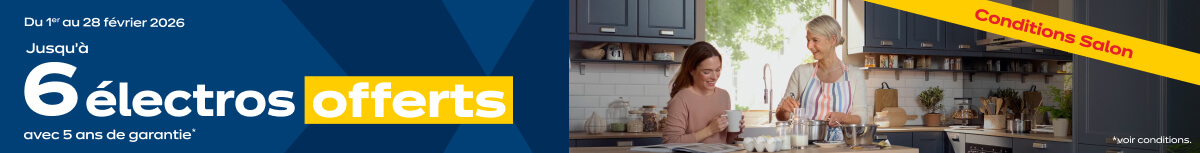 • A partir de 11.500€ TTC d’achat de meuble : un four, une table de cuisson, une hotte, un lave-vaisselle & un réfrigérateur offerts dans la limite d’une valeur totale de 2.300€ ;