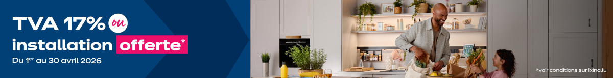 * Conditions générales : Offre « TVA offerte ou installation offerte » valable du 1er au 30/04/2026 pour l’achat d’une cuisine équipée dans un magasin ixina au Luxembourg. Au choix: (i) « TVA offerte » : pour tout achat d’une cuisine équipée comprenant au minimum 2.500€ TTC de meubles (hors modèle Vita, accessoires, électroménagers, sanitaires, cuisines d’exposition, livraison et pose), votre magasin ixina vous offre sous forme de remise l’équivalent de la TVA à 17%, soit une remise de 14,5% sur le prix TVAC des meubles, - OU - (ii) « Installation offerte » : pour tout achat d’une cuisine équipée d’une valeur totale de 2.500€ TTC minimum : meubles + 4 électroménagers minimum + sanitaire (hors modèle Vita accessoires, Cotisation Ecotrel et cuisines d’exposition), votre magasin ixina vous offre l’installation (hors livraison) de votre cuisine. L’offre « Installation offerte » est valable uniquement pour un chantier préparé conformément aux conditions communiquées par votre magasin ixina. Offres réservées aux particuliers.
