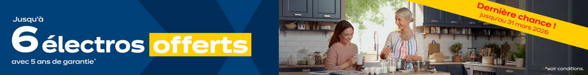 * Conditions générales : Offre « Jusqu’à 6 électros offerts » - prolongation : valable du 1er au 31/03/2026 pour l’achat d’une cuisine équipée à partir de 2.850€ TTC de meubles (hors modèle Vita, accessoires, électroménagers, sanitaires, cotisation Recupel, cuisines d’exposition, livraison et pose) livrée et posée par votre magasin ixina au Luxembourg auprès duquel l’achat est effectué. Jusqu’à 6 électroménagers offerts sur une sélection présentée par votre magasin et dans les conditions suivantes :